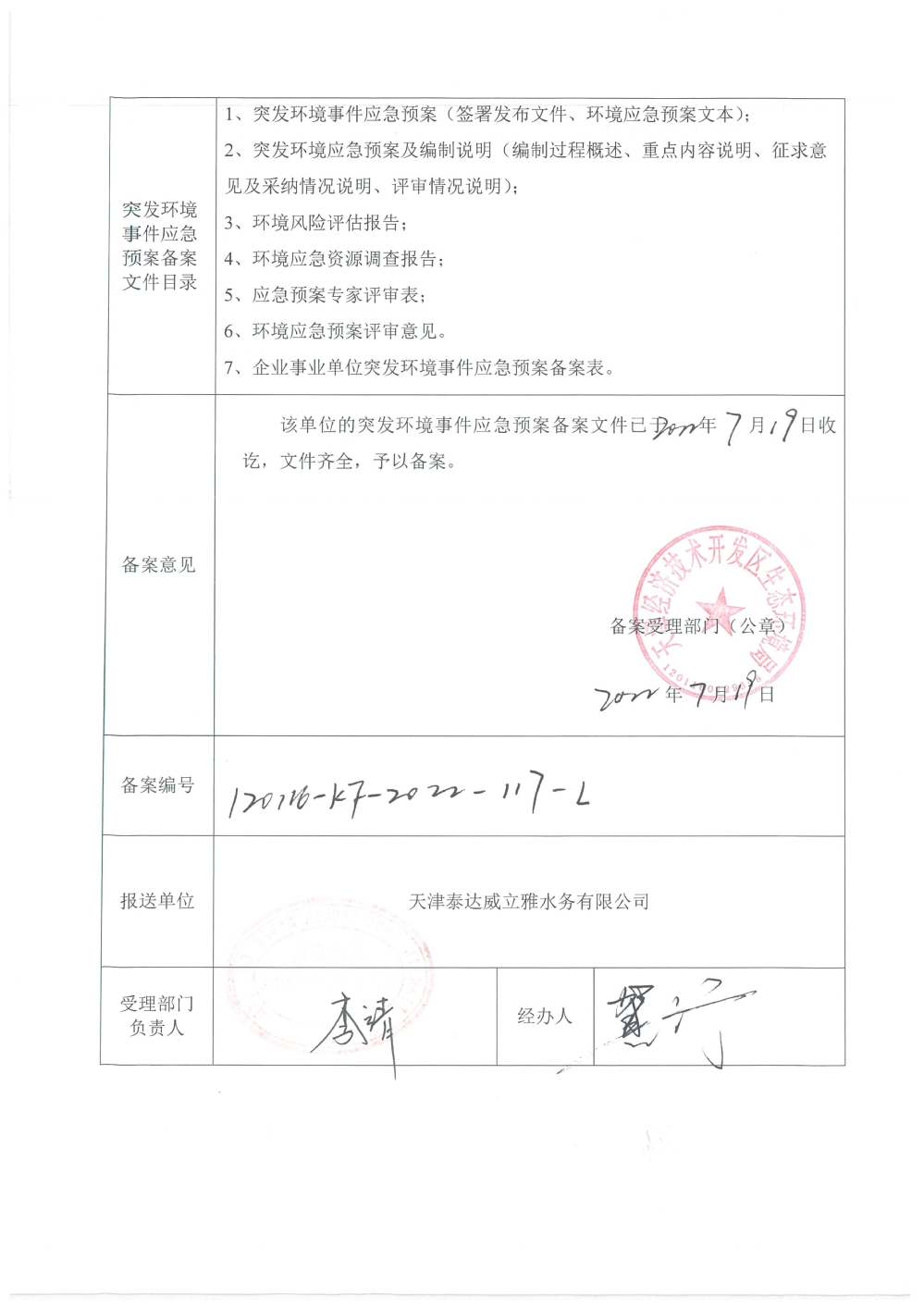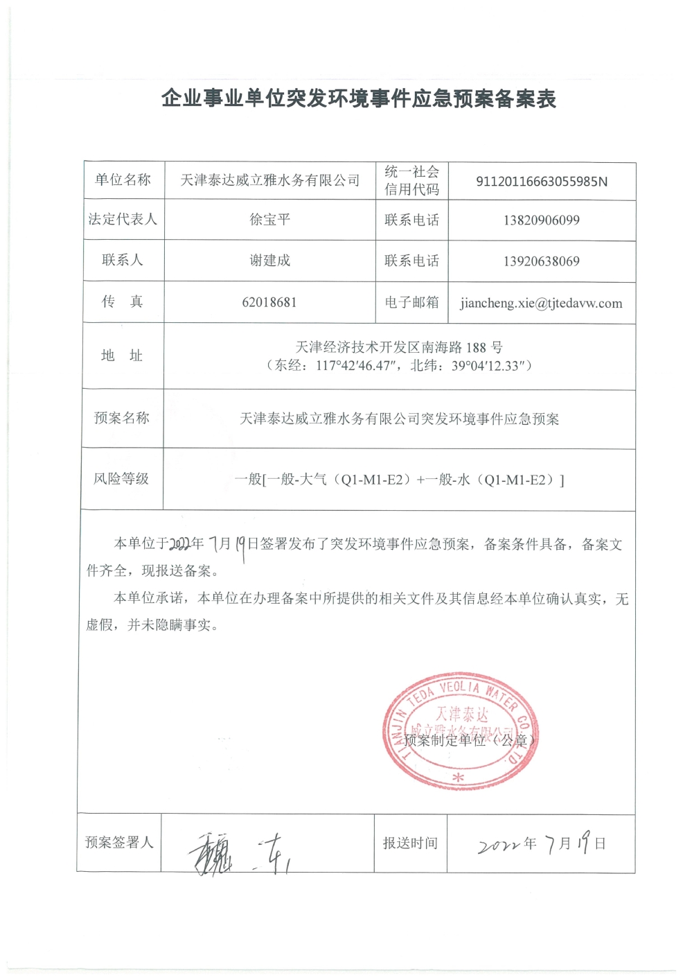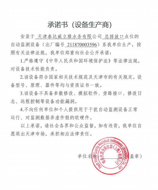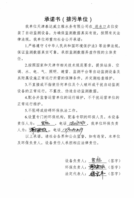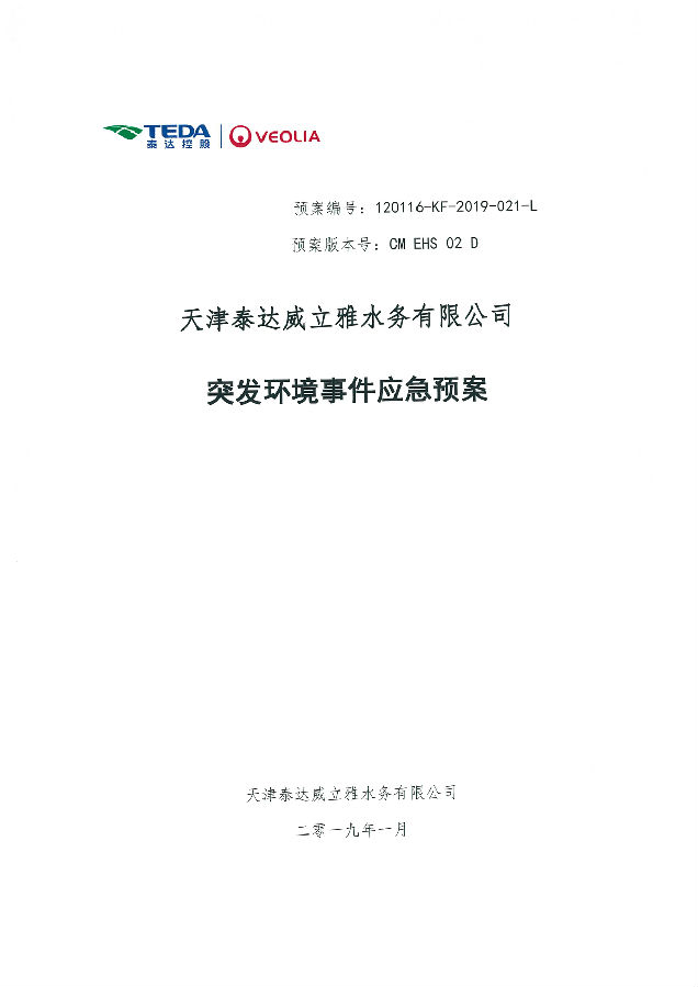 ? 公司出水指標數據經現場數據采集儀采集后直接上傳至天津開發區環保局及天津市環境監測中心。天津市環境監測中心直接將接收自公司的上傳數據發送至國家環保部。實現了對我公司出水指標數據的實時在線監控和監督管理。 自2014年,依《國家重點監控企業污染源監督性監測及信息公開辦法(試行)》,主要污染物排放情況經天津市重點企業自行檢測數據發布系統對外公布,主動接受社會公眾監督。 信息發布平臺 2025年第2季度環境信息公開:天津泰達威立雅水務有限公司 公司名稱:天津泰達威立雅水務有限公司 統一社會信用代碼:91120116663055985N 法定代表人:徐寶平 生產地址:天津經濟技術開發區南海路188號 聯系電話:022-62018666 處理規模:10萬m3/日市政污水 生產經營和管理服務的主要內容: 水處理系統工程集成;城市污水處理、工業廢水處理、海水及苦咸水淡化處理;再生水、工業純水、水處理設備銷售;水處理設施運營、管理及相關的設計、咨詢、技術服務。 其他信息: 天津泰達威立雅水務有限公司成立于2007年7月。天津泰達投資控股有限公司與法國通用-威立雅水務集團各持股51%與49%。由天津經濟技術開發區管理委員會公用事業局授權,天津泰達威立雅水務有限公司負責開發區第一污水處理廠及其附屬設施、海晶東雨污水泵站、開發區電鍍廢水處理中心的運營、維護保養及經營。 項目(出水) 平均值(mg/L) A標準(DB12/599-2015) (mg/L) 化驗次數(次) 合格率(%) 我公司排放口數量為一個,位于廠區東南側。處理后出水排入市政專用排污管道,經北排泵站排入渤海灣。2025年4-6月我公司COD、氨氮、總氮、總磷排放總量如下: 168.92 天津泰達威立雅水務有限公司為原天津經濟技術開發區污水處理廠,是天津濱海新區第一座污水處理廠,位于開發區南海路與第十二大街交口處,污水處理項目投資總額3.5534億元人民幣,占地8.1公頃,設計能力為日處理污水10萬m3,其中市政污水的比例高于60%。污水處理工藝目前采用“預處理+SBR+反硝化濾池+臭氧催化高級氧化+紫外消毒”。脫水機房、進水泵房、預處理單元和儲泥池的臭氣經過收集管道收集進入生物過濾塔除臭處理。剩余污泥經脫水機脫水處理,泥餅外運處理。工藝系統由在線儀器儀表輸送到中控室實現自動控制。 出水水質達到天津市《城鎮污水處理廠污染物排放標準》(DB12/599-2015)A排放標準。廠界噪聲均滿足《工業企業廠界噪聲標準》GB12348-2008(3類)晝、夜標準值。廠界無組織排放廢氣中臭氣濃度、氨、硫化氫濃度均符合《惡臭污染物排放標準》(GB12/059-2018)限值要求。 開發區第一污水處理廠現狀主要的大氣影響來自預處理單元(格柵與沉砂池)和污泥區(污泥脫水機房)的惡臭氣體。污泥脫水機房、污泥料倉、三合一泵房等設施產生的臭氣集中收集,儲泥池、預處理單元等采用加罩密閉設計,臭氣集中收集至生物除臭裝置,除臭效率不低于80%,處理后由15米高排氣筒達標排放。根據天津市環保局《關于天津開發區第一污水處理廠改造工程環境影響報告書的批復》,開發區第一污水處理廠的衛生防護距離設為100m。 污水廠廢氣監測結果表明,廠區周界監測點位臭氣濃度均低于20(無量綱),符合《惡臭污染物排放標準(GB12/059-2018)的標準要求。 開發區第一污水處理廠污水經處理后達到天津市《城鎮污水處理廠污染物排放標準》(DB12/599-2015)A排放標準要求。污水處理廠工藝過程本身沒有生產性廢水排放,所排污水主要為生活污水和污泥處理水,這部分廢水一同返回本污水處理廠的進水泵房,與市政污水一并處理。2025年4-6月出水達標率為100%,無超標情況。 開發區第一污水處理廠主要的噪聲設備為鼓風機,鼓風機位于鼓風機房,并設置隔音減震措施,其噪聲影響甚微。 監測結果:廠界噪聲共設置4個噪聲監測點,執行《工業企業廠界環境噪聲排放標準》(GB12348-2008)3類標準,根據監測結果,各廠界處噪聲均符合執行標準要求。 污水廠運行過程中產生的固體廢棄物主要為柵渣、沉砂、污泥及生活垃圾。生活垃圾和柵渣交由開發區環衛綜合服務公司清運處理;產生的脫水污泥委托天津恒基環境工程有限公司和天津萬德生物工程有限公司進行資源化、無害化、減量化處理。 編 號 名 稱 發 布 單 位 批號 時 間 1 《關于天津經濟技術開發區10萬噸/日污水處理廠項目環境影響報告書的批復》 天津市環境保護局 津環保管 (1998)第43號 1998.2.18 2 《關于天津開發區污水處理廠改造工程環境影響報告表的批復》 天津經濟技術開發區 環境保護局 津開環評 【2008】198號 2008.12.8 3 《天津經濟技術開發區環境保護局關于天津經濟技術開發區第一污水處理廠提標改造工程環境影響報告書的批復》 天津經濟技術開發區 環境保護局 津開環評書 【2017】18號 2017.8.30 我公司根據《中華人民共和國環境保護法》以及《天津市突發事件總體應急預案》等相關文件要求,于2019年1月編制(修訂)完成了《天津泰達威立雅水務有限公司突發環境事件應急預案》,于 2022年7月19日完成變更備案并發布(備案編號:120116-KF-2022-117-L)。 天津泰達威立雅水務有限公司 2025年7月8日